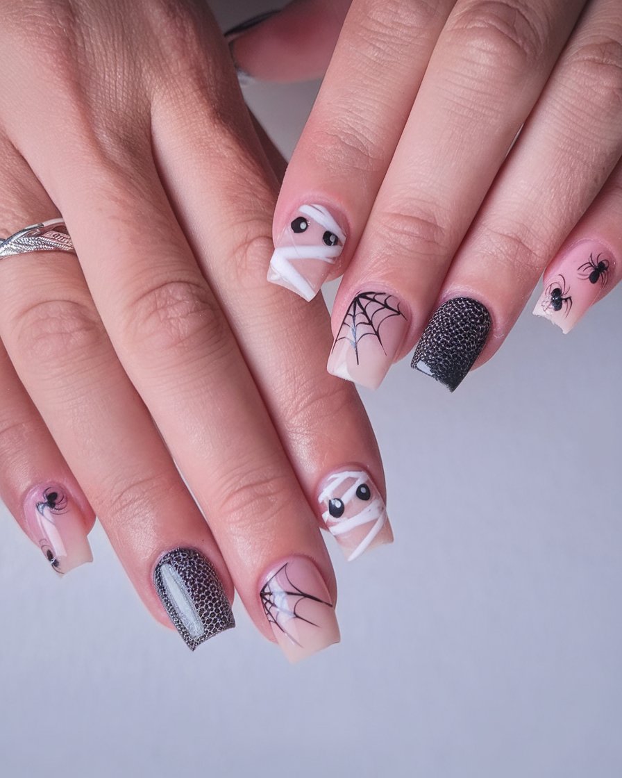 Does anyone realize that short square nails can be so charismatic? The cracked black texture and white fine details make this mummy-and-web set spooky but glamorous at the same time. It’s the perfect subtle scare.