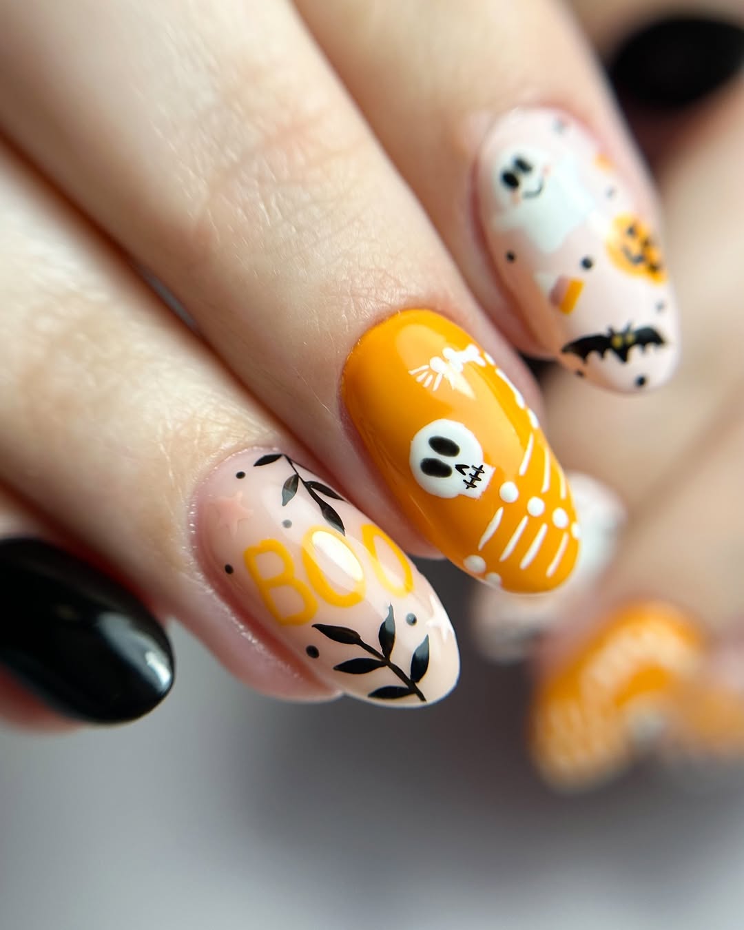 This would be the nail set of the spooky cute. Having pastel pumpkins, floating ghosties, and a bit of the word, boo, written in neon font, this will have a soft, fun, and surprisingly pleasant look. It is Halloween and the girl that adores cotton candy skies and black eyeliner.