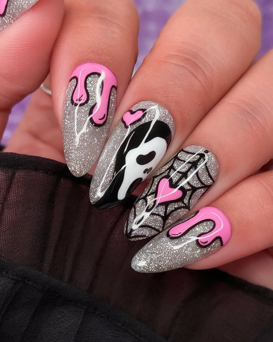 Silver glitter base with neon pink drips and a scream mask of both glam and ghouls; this outfit is all attitude. Even the spiderweb sparkles. It is as though your fingernails are out on a clubbing trip to a haunted rave.