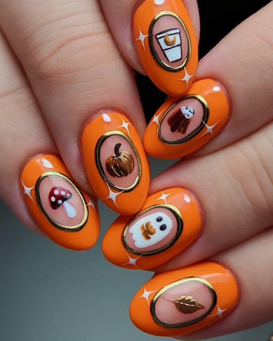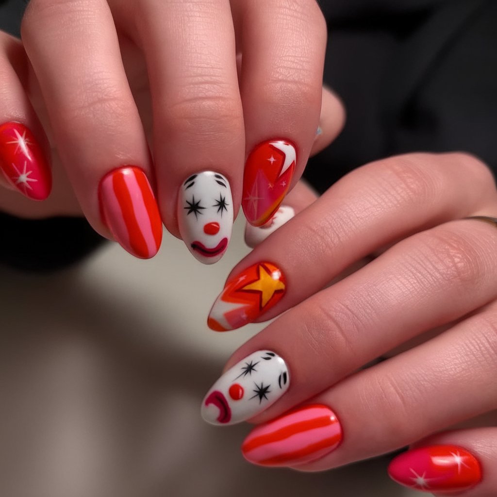 These are the nails that take the circus to Halloween by applying retro clown faces on candy stripes and twinkling stars using fiery orange and red colors. They are joyful, mischievous and a bit creepy, as they ought to be at Halloween.
