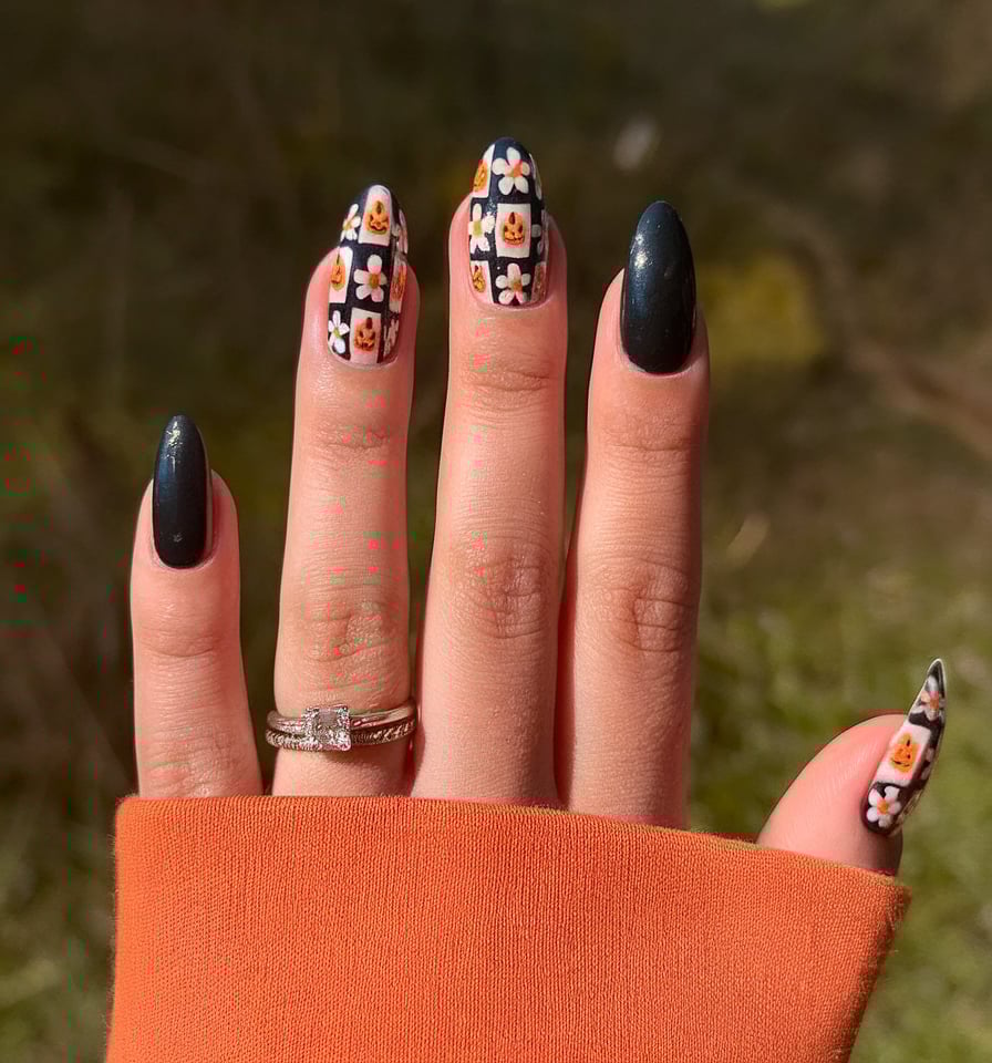 The longer almond nails are flattering to all shapes and easy to design on huge spaces. The matte base is more adult, and the fun is created with childish colors. Perfect for those who want spooky without the scare.