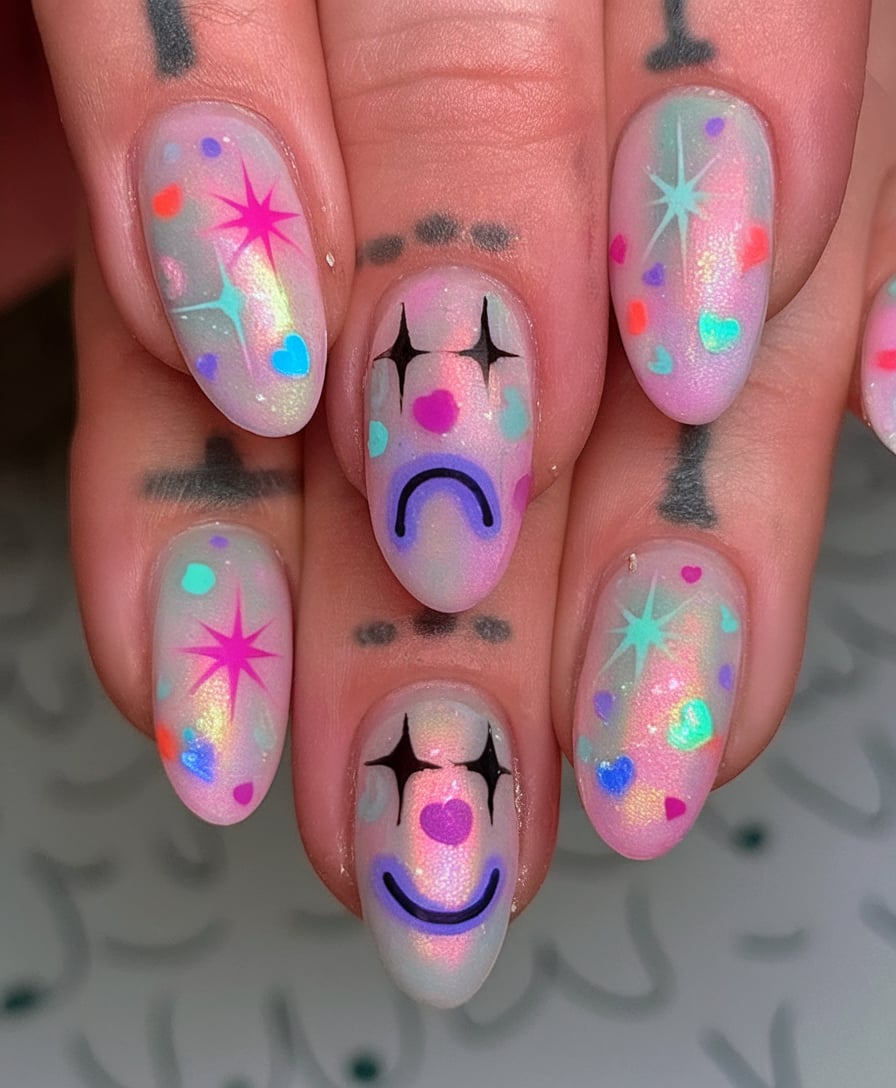 These nails at first sight can be considered cheerful but take a bit of a longer look and you will see the surreal sadness of crying out clown faces. It is scary and fun at the same time, and iridescent glimmer and neon accents make it fit perfectly into the maximalist trend wave planned to be at peak by 2025.