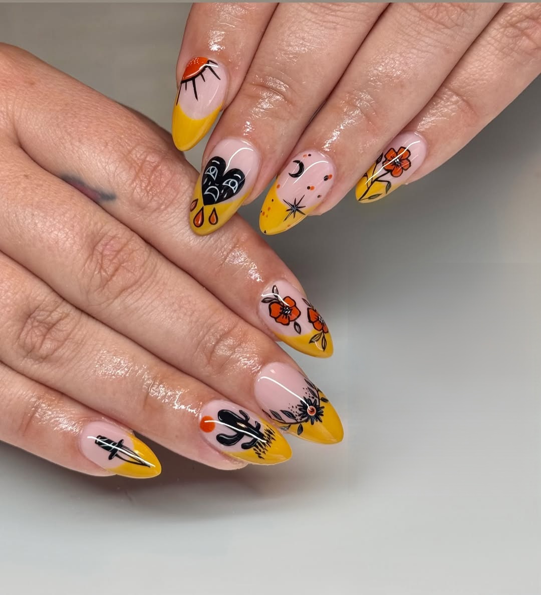 At sunset yellow, midnight mystery get together in this surprising turn to Halloween nails. Stars, bats, cacti, and eyes are united in the surreal book on your hands. It’s bold, artsy, and totally one-of-a-kind.
