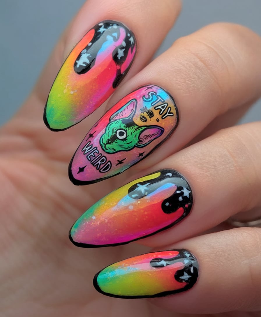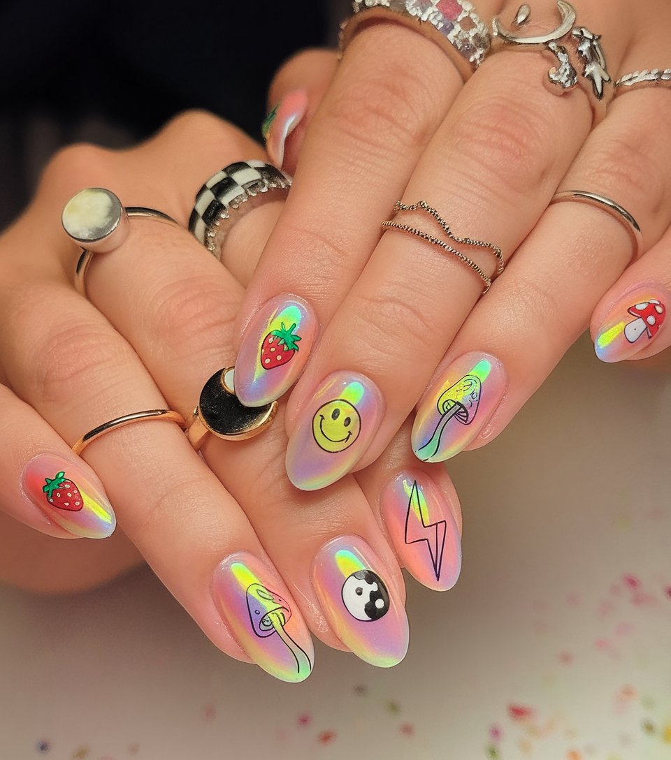 These are some nails to are in a statement of fans of 3D and layered designs of art. The rainbowish foundation is all the rage this 2025 and they would kill any costume party, especially coupled with the holographic accessories.