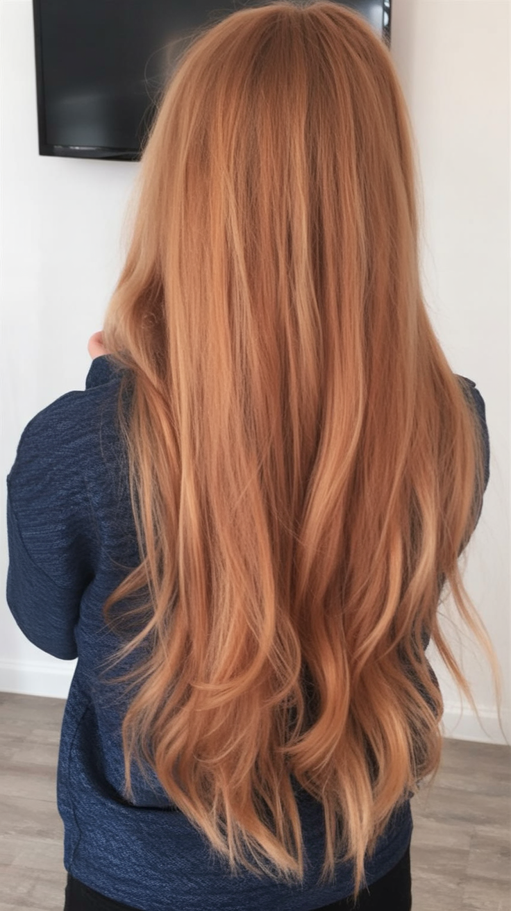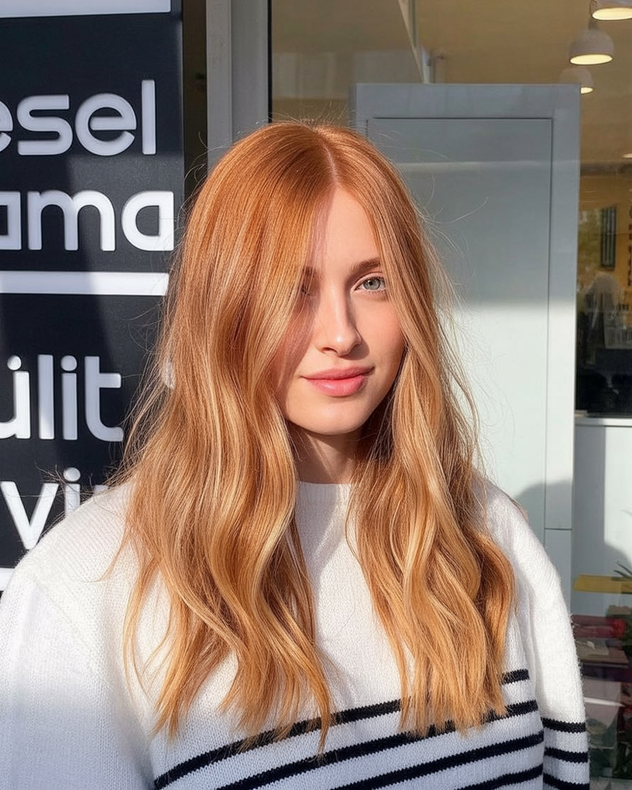If you love the drama of long hair, this sleek strawberry shade feels like a designer dress you can’t wait to wear. The color sits between golden and copper, catching every bit of light so your hair almost looks backlit in the sun. It’s bright enough to turn heads without screaming for attention, and there’s something very grown-woman confident about hair that simply falls, glossy and healthy, down your back.