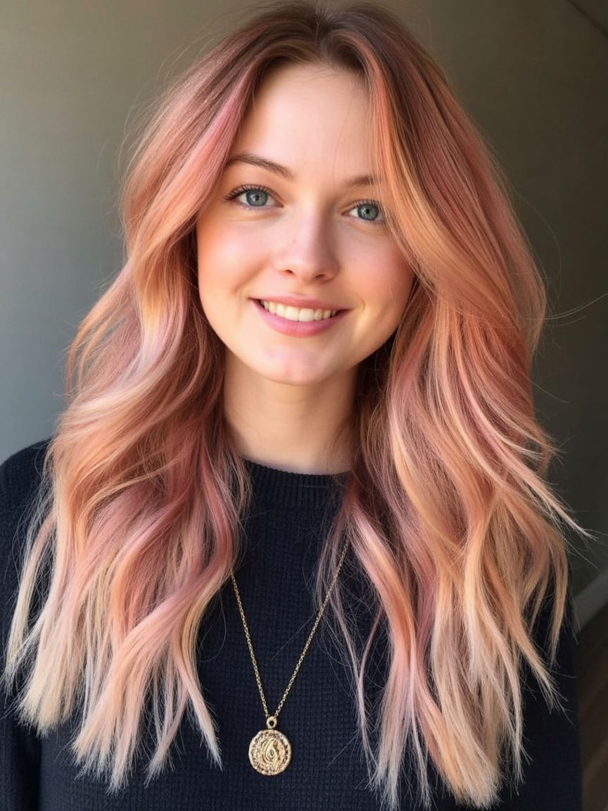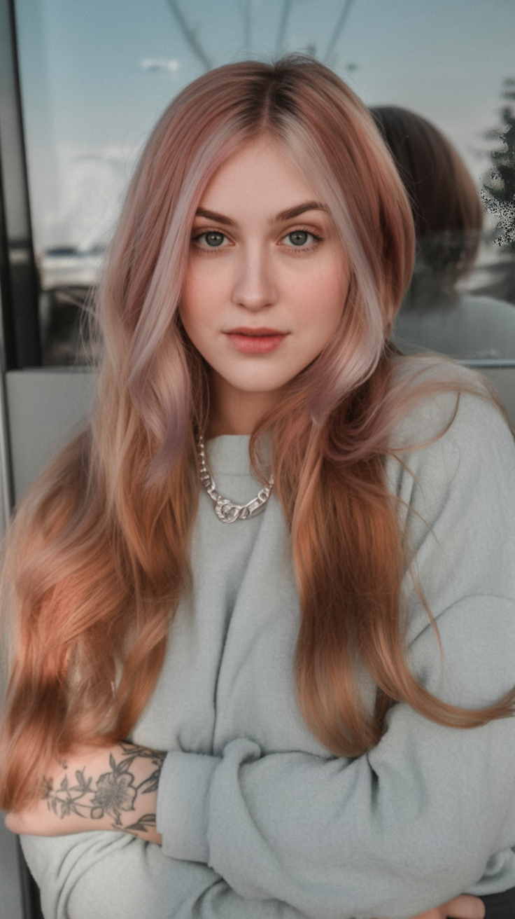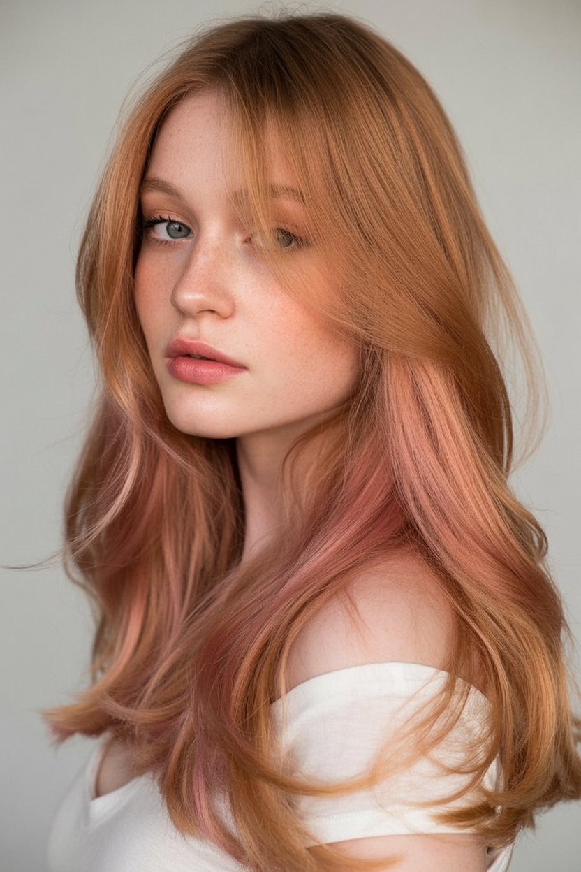 This style shines on anyone with straight or slightly curly hair who wants more body without committing to a very layered cut. It’s especially gorgeous on pale skin and on women with brown eyes, because the warmth of the color acts like a built-in soft-focus filter. Ask your colorist to show you a few swatches before they mix the formula so you can fine-tune just how pink or copper you want the final color to be.