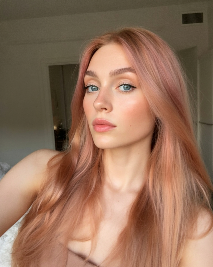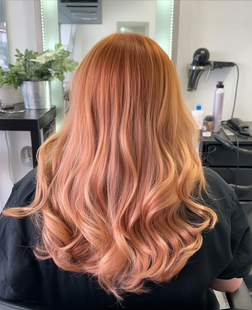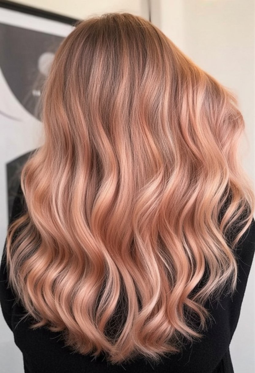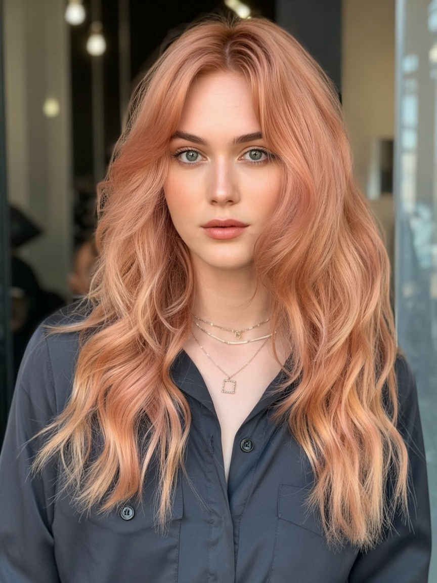 This rose gold version of strawberry blonde is like wearing a soft filter on your face all day. The rosy tint gives cheeks a natural flush, while the peachy lengths keep the overall color from looking too sweet. Paired with loose waves and a relaxed middle part, it feels modern and a little bit dreamy, the kind of hair that makes even jeans and a tee look styled on purpose.