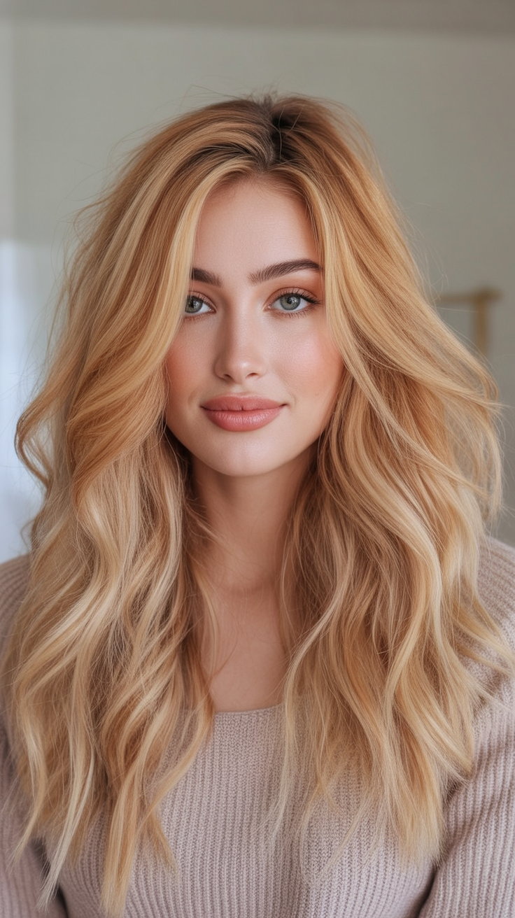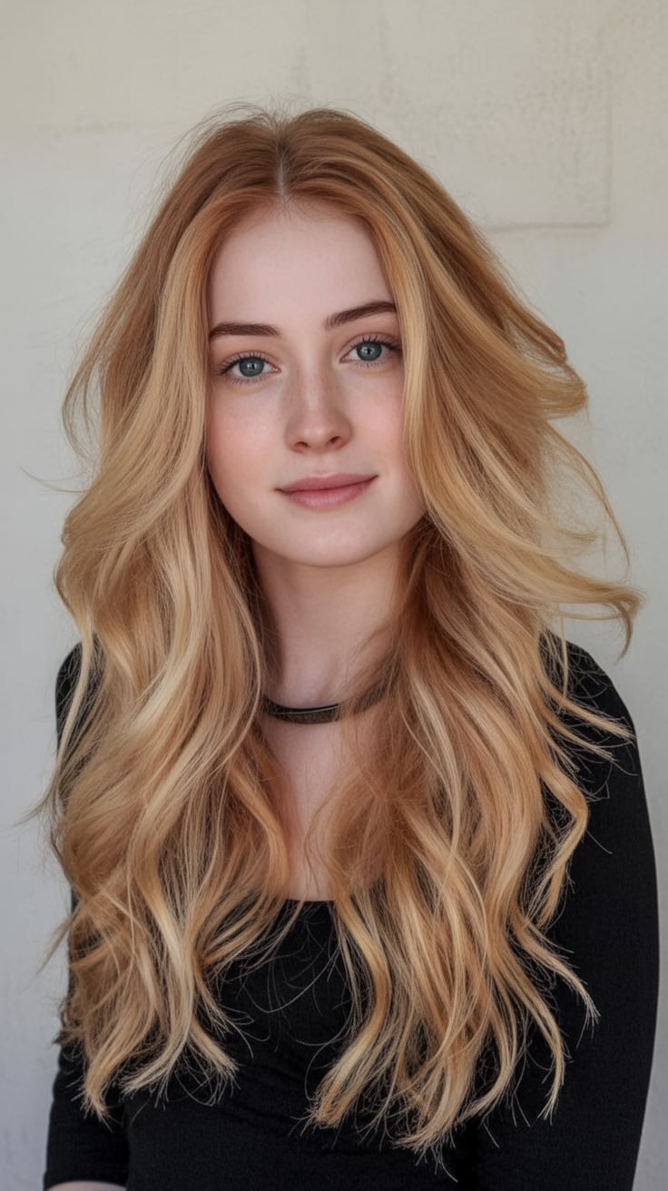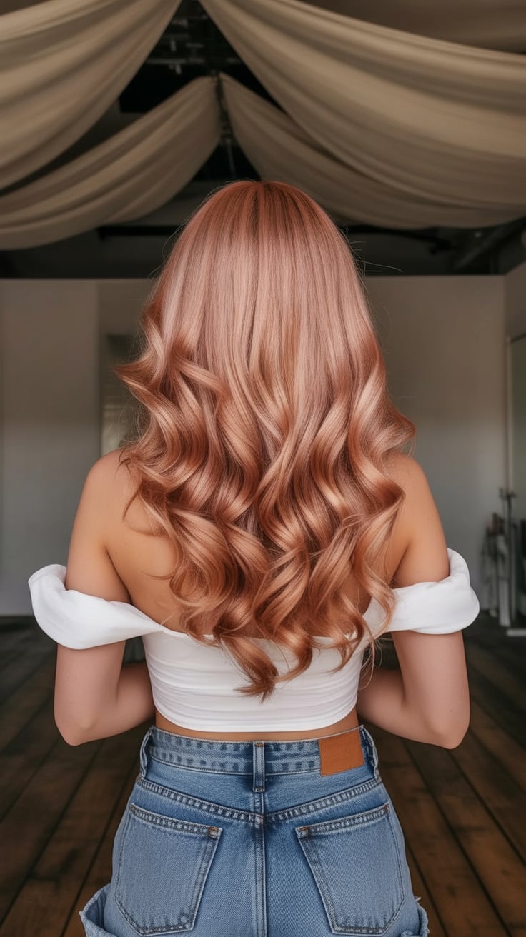 This rose gold version of strawberry blonde is like wearing a soft filter on your face all day. The rosy tint gives cheeks a natural flush, while the peachy lengths keep the overall color from looking too sweet. Paired with loose waves and a relaxed middle part, it feels modern and a little bit dreamy, the kind of hair that makes even jeans and a tee look styled on purpose.
