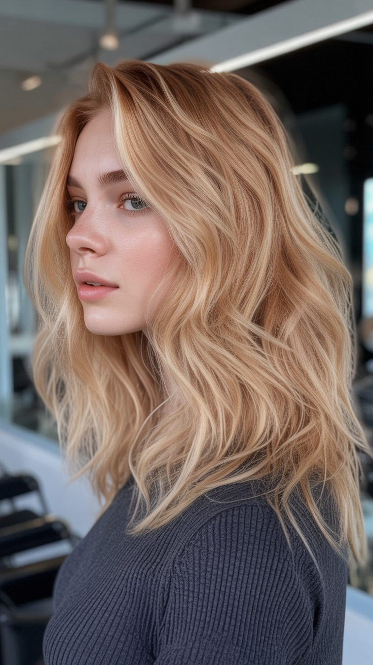 This bright, sunlit strawberry blonde practically glows, especially when you’re outside. The color walks that line between copper and blonde with a bright, cheerful finish that instantly softens your features. Loose waves starting around the cheekbones give it a casual, windswept feel, like you’ve just spent the day at a rooftop brunch instead of commuting or answering emails.