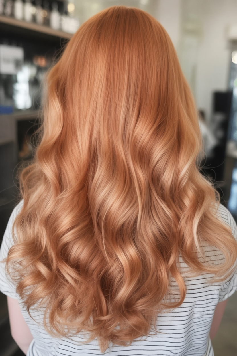 Here, the hair moves from a richer strawberry at the roots into lighter, peachy lengths, almost like a soft ombré glow. The waves are polished but still touchable, giving that fresh-from-the-salon feeling without looking stiff. It’s a gorgeous way to wear strawberry if you like a bit more depth near the scalp rather than a single all-over color.