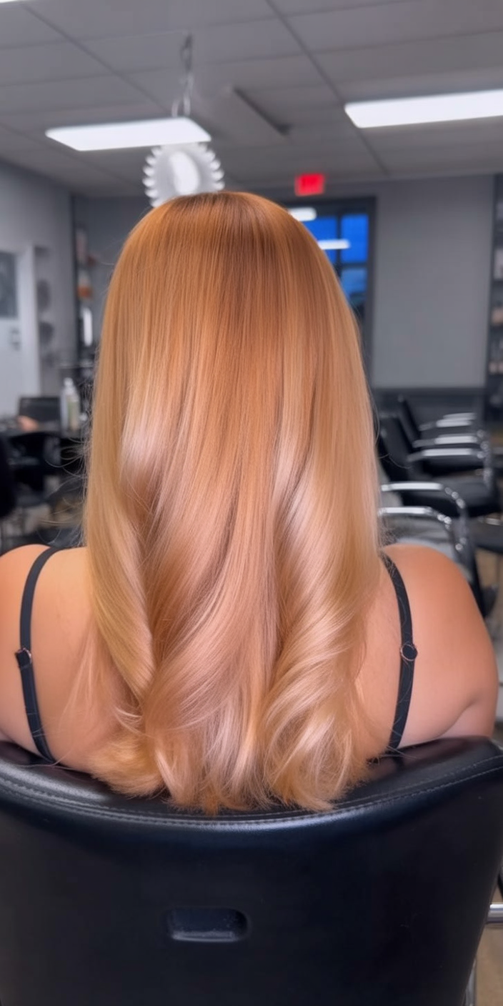 This sleek take on strawberry blonde skips the big waves and goes for a smoother, more minimalist finish. The color is a refined mix of light strawberry and honey, with just enough sheen to catch the eye without screaming for attention. It’s the kind of hair that makes even a simple camisole look styled and intentional.