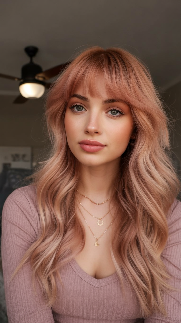This rooted strawberry shade with airy bangs feels like the perfect blend of sweet and sophisticated. The fringe sits just at the lashes, softening the eyes, while the rest of the hair falls in relaxed waves that give plenty of movement. The color is a gentle mix of strawberry and rose gold, so it works beautifully in both winter and summer without looking too seasonal.
