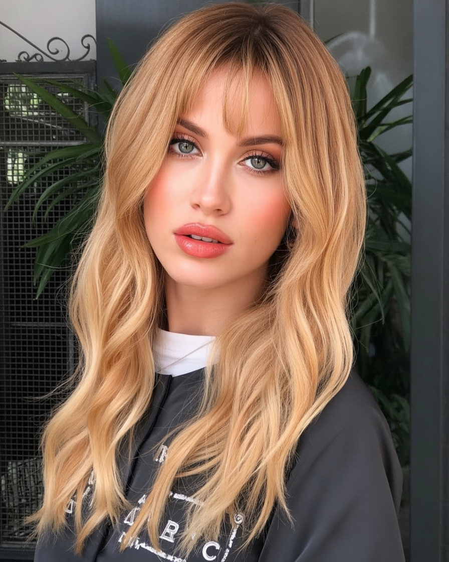 What makes this cut unique is the balance between the soft bangs and the longer layers. The fringe is light enough to push to the side on days you want a change, and the lengths are cut to encourage natural texture, whether your hair is straight or slightly curly. The deeper, blurred root mimics a subtle root melt, giving depth at the crown and helping the overall color look expensive and modern rather than flat.