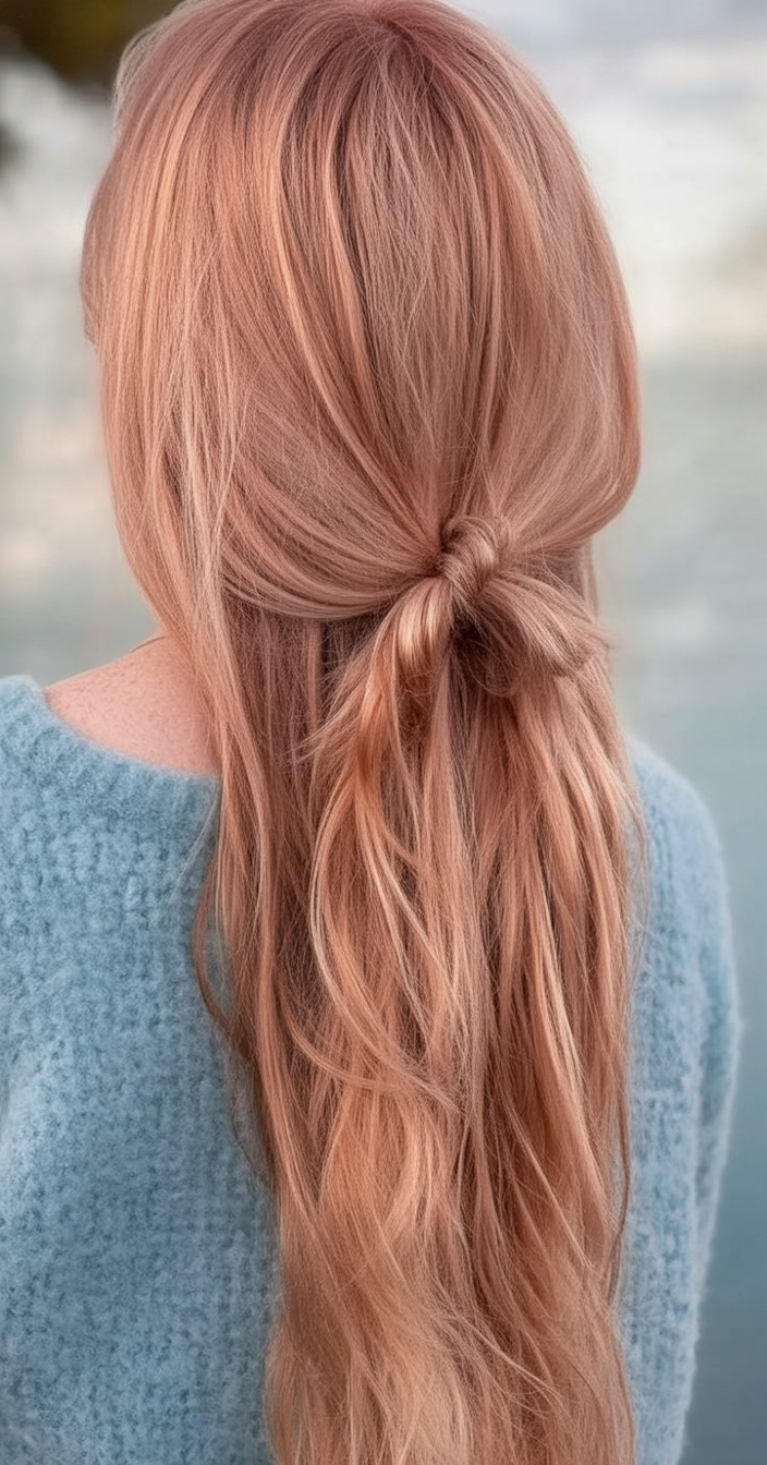 This loose half-up knot is the romantic, “I just stepped out for coffee by the water” version of strawberry blonde. The lengths fall in soft, slightly tousled waves, while the twisted knot at the back adds just enough structure to look intentional. The color itself is a dreamy mix of strawberry and rose gold, catching the light in a way that feels almost reflective. It’s the kind of easy styling that makes even a cozy sweater and jeans look like a thought-out outfit.