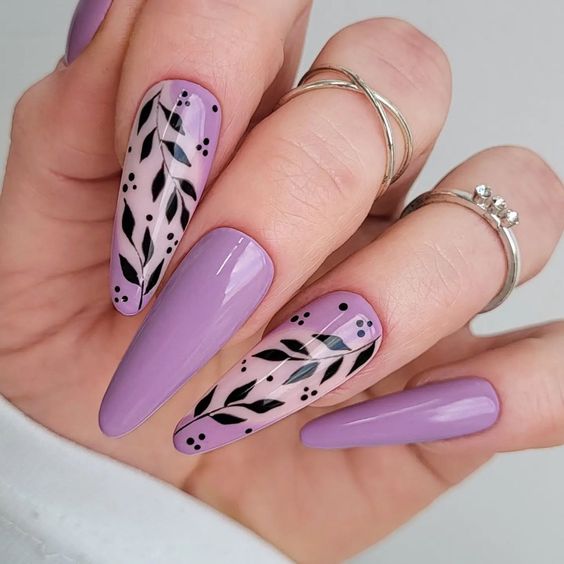 For a softer take on fall aesthetics, these nails blend muted lavender with delicate floral patterns. Fine black detailing outlines minimalist leaves and petals, crafting a subtle yet intricate design. The look bridges summer’s end and the onset of fall, perfect for transitional attire.