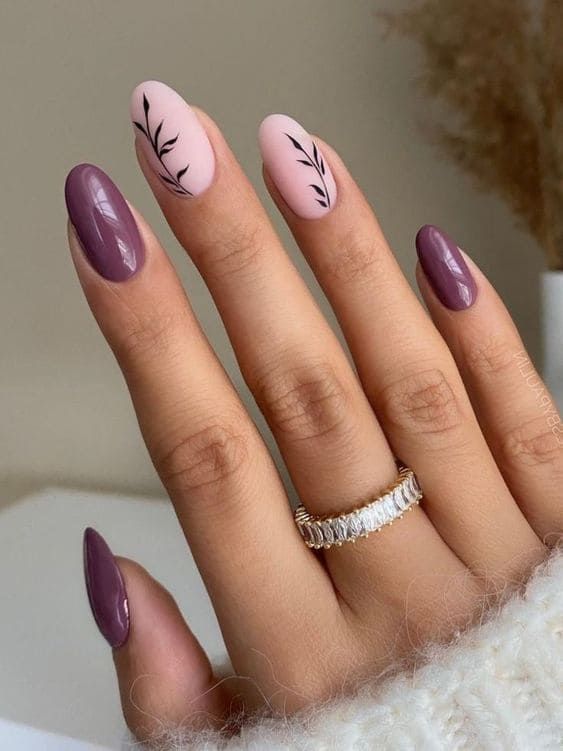 Soft pastels provide a serene background for bold, black botanical line art in this elegant design. It’s a lovely choice for anyone who appreciates the subtle interplay of simplicity and detail, perfect for serene autumn days. This style is also a great canvas for showcasing design almond nails, adding an edge of sophistication.