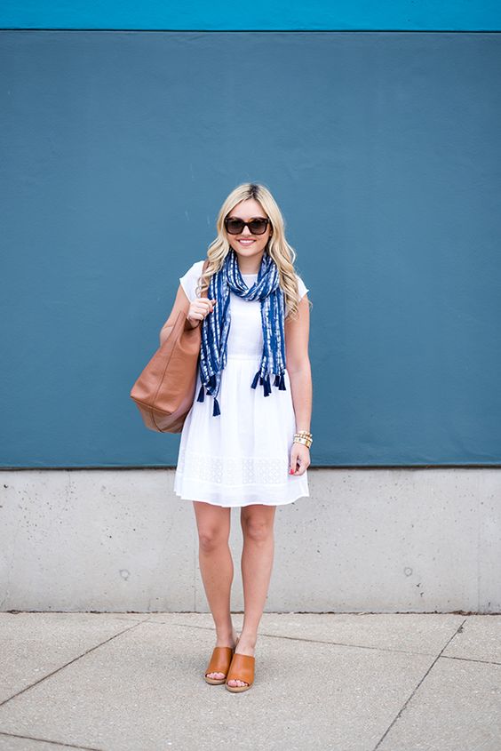 A bright white sundress becomes the epitome of chic with the addition of a navy blue scarf. Perfect for a summer day in the city, this outfit is complemented by tan leather sandals and a matching tote, proving that summer outfit ideas can be both cute and sophisticated.