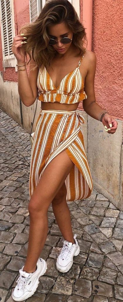 For those who mix comfort with style, a striped crop top paired with a high-slit skirt and chunky sneakers offers an aesthetic that’s casual yet trendy. It’s one of the summer outfit ideas for women who enjoy an active day out without compromising on style.