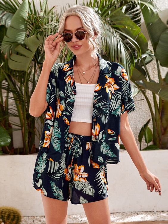 For those who prefer a tropical theme, a floral shirt and matching shorts offer a getaway vibe, perfect for a beach day or a summer party. It’s a summer outfit idea for women that brings vacation to your wardrobe.