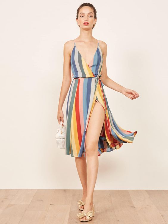 Stripes take center stage in this dynamic wrap dress, offering an aesthetic that’s both playful and elegant. Perfect for a party or a birthday celebration, this look encapsulates the joy of summer with its breezy silhouette and a daring slit that catches the breeze just right.