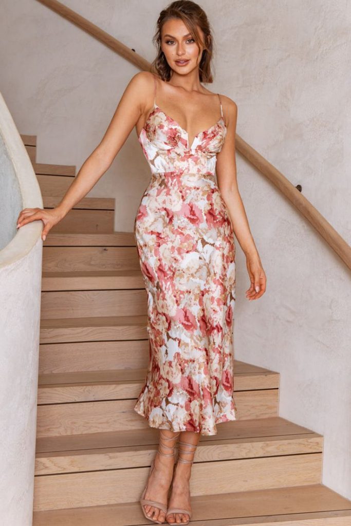 Summer brings with it the perfect opportunity to don floral patterns, and this floral midi dress with a flattering silhouette is ideal for any wedding or upscale party. Its soft fabric and romantic prints encapsulate summer outfit ideas aesthetic.