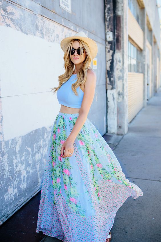 Capture the essence of summer with a light pastel crop top paired with a flowing floral maxi skirt. This ensemble is a celebration of summer outfit ideas that are as breezy as they are beautiful, perfect for a day by the seaside or a relaxed evening get-together.