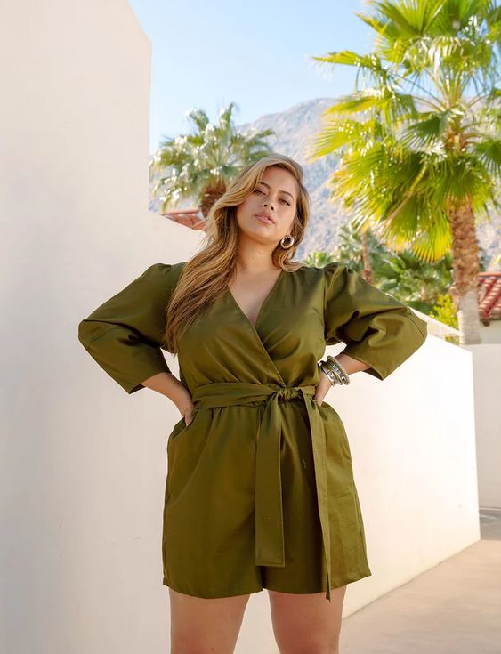 An olive romper with voluminous sleeves and a cinched waist offers a modern twist on summer casual. It’s a single piece that makes a statement, ideal for a summer outfit idea that transitions seamlessly from a baby shower to a casual dinner.