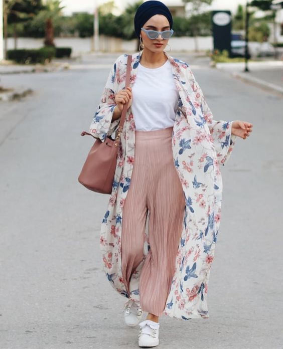 Modesty fashion is beautifully represented with this longline floral coat over pleated pants. It’s a perfect example of summer outfit ideas that incorporate hijabs, offering elegance and coverage without sacrificing style.