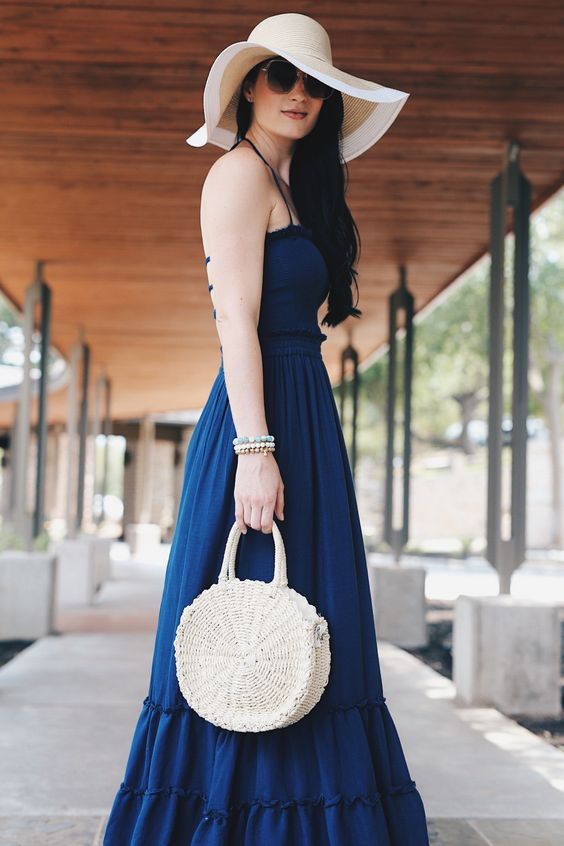 Embrace the spirit of the ocean with this navy blue maxi dress, complemented by a straw bag and a wide-brimmed hat. This look is not just about comfort but also about making a statement with minimal effort, ideal for those who lean towards summer outfit ideas aesthetic.