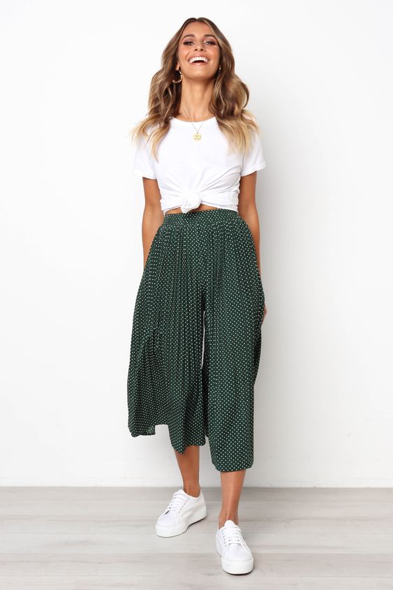Combine comfort with style in a white knotted tee and high-waisted polka dot culottes. This outfit is for those who appreciate summer outfit ideas for women that strike a balance between laid-back and polished.