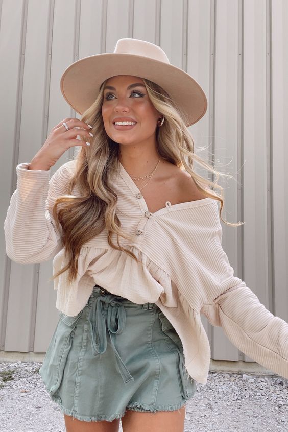 Nothing says summer like an off-shoulder top paired with utility shorts. The ensemble is a nod to southern charm, offering a blend of comfort and aesthetic appeal, perfect for a weekend getaway.