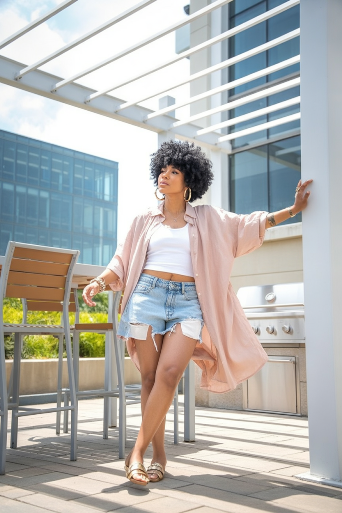 This is the kind of look that makes a simple afternoon on the patio feel like a mini vacation. The long, floaty shirt catches the breeze while the denim cutoffs and tank keep everything grounded and relaxed. It is the perfect balance of covered and carefree, ideal for summer get-togethers where you want to look put together but not overdone. Think poolside barbecue, rooftop drinks, or just walking the dog and suddenly realizing you look like street-style inspo.