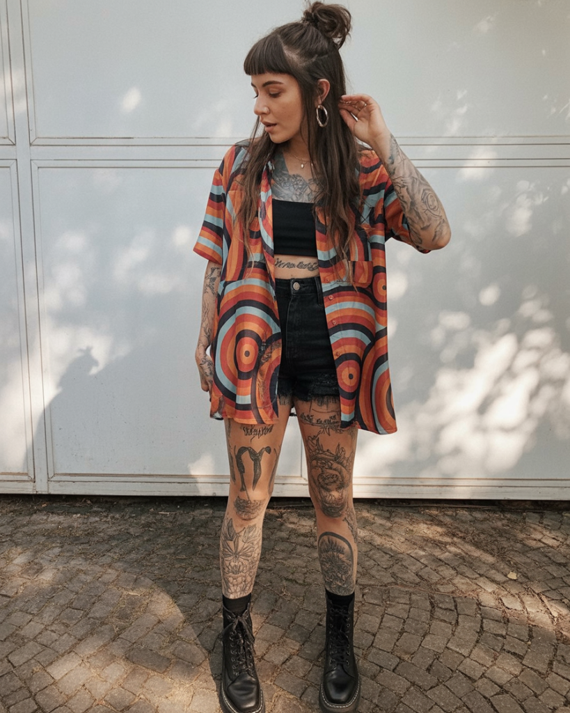 This look is pure art-teacher-on-vacation energy in the best way. The retro-patterned shirt, tiny black shorts, and chunky boots feel rebellious but still thoughtfully styled. It is the outfit you wear when you want people to know you have great taste in music and even better opinions on vintage shops. Perfect for concerts, weekend markets, or a casual night out, it lets your personality lead long before you say a word.