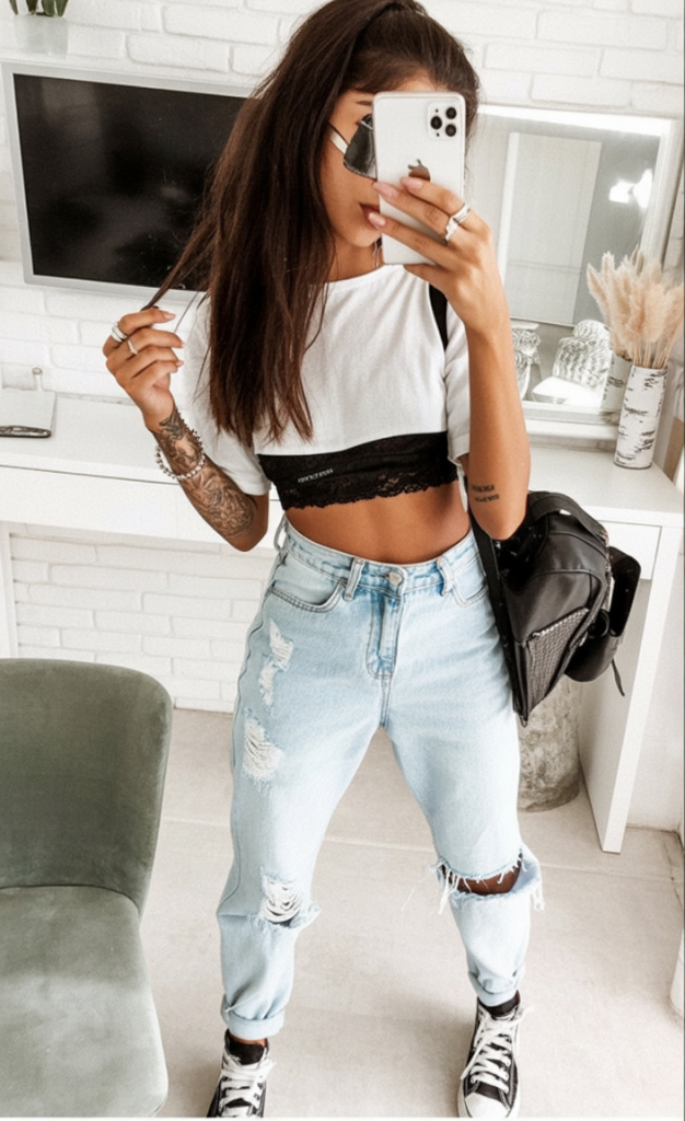 If you secretly love teen summer style but want a grown-woman version, this outfit nails it. The cropped tee over the lace bralette feels flirty, but pairing it with relaxed ripped jeans and high-top sneakers keeps everything balanced and approachable. It is exactly what you throw on for coffee runs, casual dates, or a day exploring the city with a backpack slung over one shoulder. The whole look says, “I’m chill, but I still care,” which is a very 2026 mood.