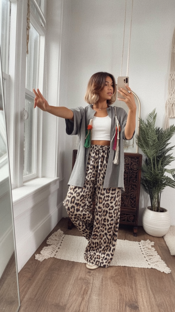 Some outfits just radiate “I’m at home in my skin,” and this one is exactly that. The wide, fluid leopard pants, tiny white crop top, and relaxed shirt with playful tassels feel equal parts artsy and cozy. It’s giving grown-up boho, like you’ve just finished rearranging your plants and now you’re dancing around the living room with a coffee in hand. The whole look is soft, slouchy, and fun, but those little details—the jewelry, the bare midriff, the print—keep it firmly in 2026 territory instead of a 2010 festival flashback.