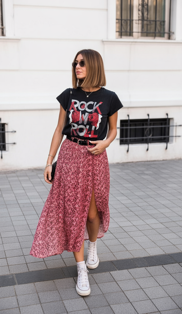 Here’s a perfect example of how women are dressing in 2026: a rock-band tee tucked into a floaty floral skirt, finished with white high-top sneakers. It’s equal parts sweet and rebellious, like you’re headed to a concert and a picnic on the same day. The belt pulls everything together, and the sunglasses add that little “don’t mess with me” edge. It’s the kind of look that turns a regular Saturday into a mini event.