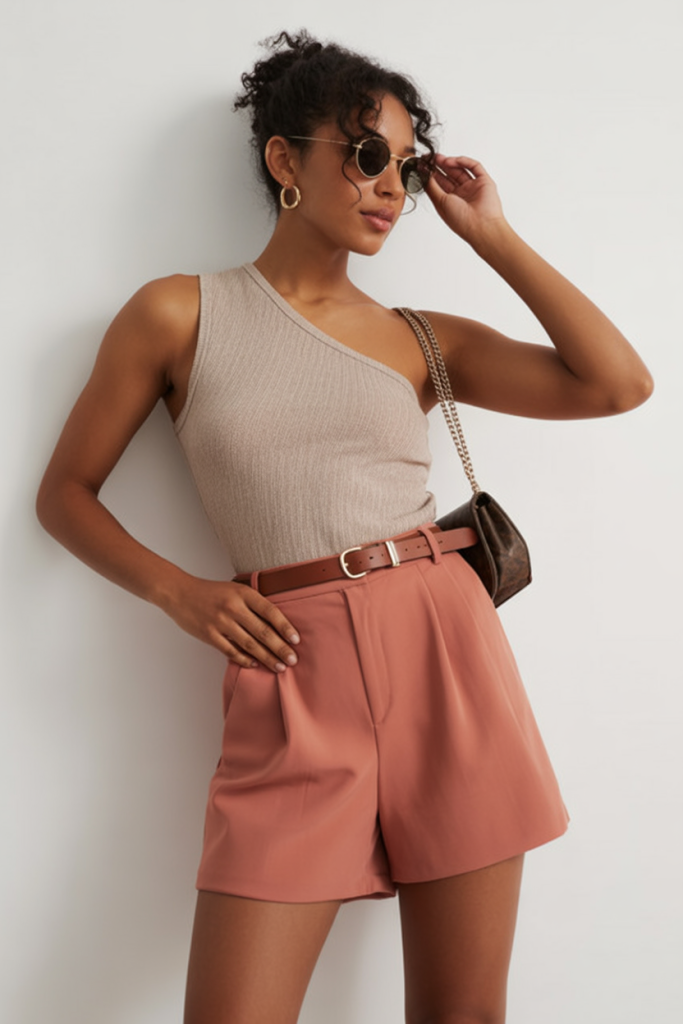 This is the kind of outfit that makes a simple iced latte run feel like a mini vacation. The one-shoulder knit top shows just enough skin to feel flirty, while the softly tailored terracotta shorts and matching belt keep everything polished. Add gold hoops, tiny sunglasses, and a crossbody bag, and you’ve got this very effortless, grown-woman version of summer inspo. It’s simple, yes, but in that quiet-luxury way that looks expensive even when it isn’t, perfect for 2026 summer brunches, rooftop drinks, or a warm night out on vacation.