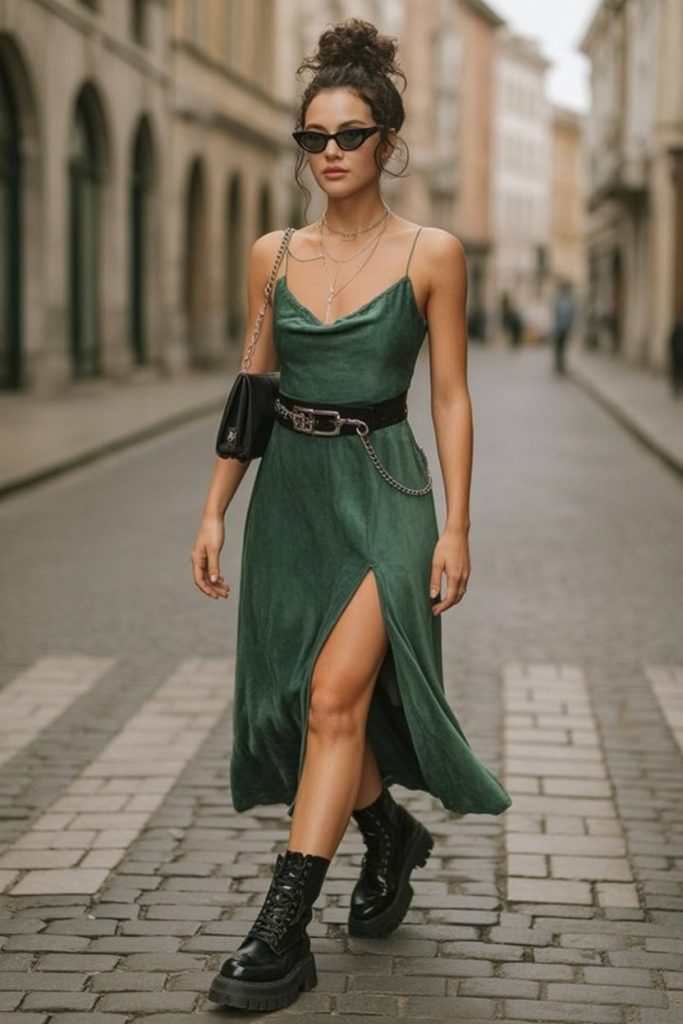 12. Emerald Slip Dress and Chunky Boots City Night Look