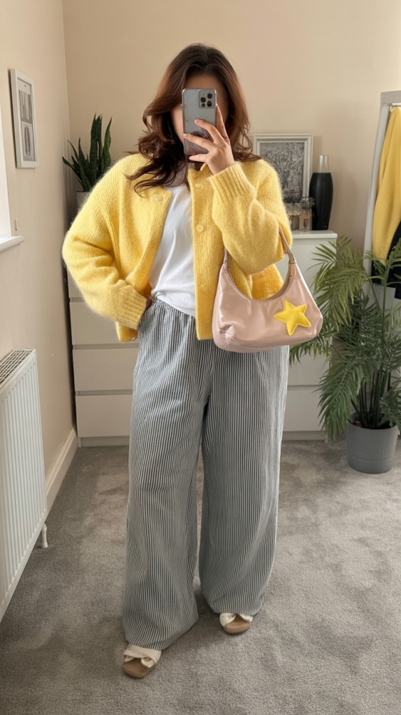 On those grey days when your energy dips, this outfit is basically wearable sunshine. The fluffy yellow cardigan, white tee, and relaxed striped trousers look like the stylish version of staying in your pajamas—but with enough polish to leave the house. There’s an easy, roomy comfort to it that feels kind to your body, while the pastel bag adds a playful little wink. It’s the sort of look that makes doing school runs or weekend errands feel a bit more special.