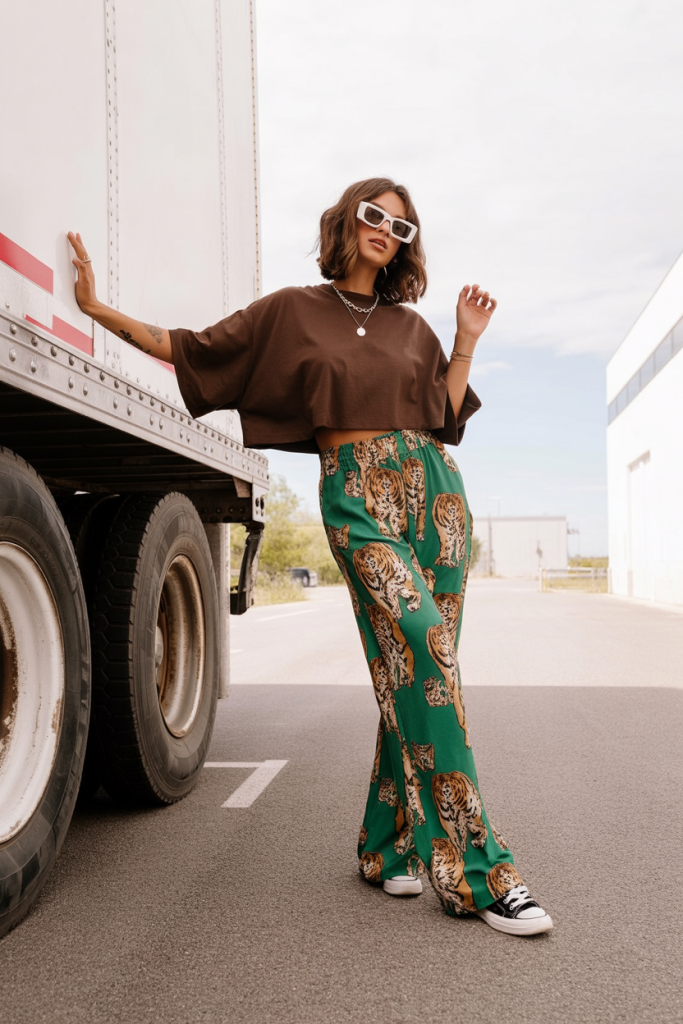These tiger print pants are for the days you’re fully in main-character mode. Paired with a wide, boxy crop tee and bold sunglasses, the whole look feels like street style snapped between meetings. There is something wonderfully playful about letting the pants do all the talking while the top stays minimal and relaxed. It is the kind of outfit that makes even a grocery run feel like a runway moment, especially in bright daylight.