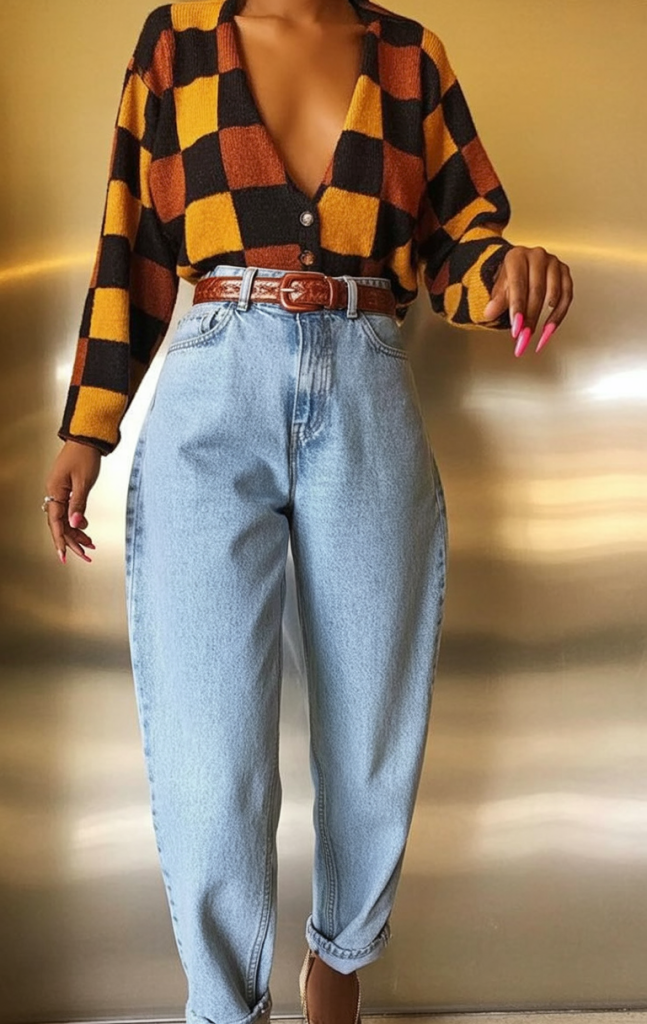 This outfit is proof that cozy does not have to mean invisible. The deep V checkered sweater feels a little bit retro and a little bit flirty, especially with the sleeves pushed up and nails on point. Paired with softly tapered light-wash jeans and a classic belt, it is the perfect balance of relaxed and polished. You could wear it to casual Fridays at work or Sunday brunch and feel like you made an effort without sacrificing comfort.