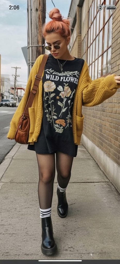 This outfit feels like a walk through your favorite bookshop on a crisp day. The floral tee dress is soft and romantic, while the chunky mustard cardigan adds warmth and personality. Fishnet tights, striped socks, and ankle boots keep it grounded and a little edgy, so it never tips into sweet-girl territory. With the messy topknot and round sunglasses, it is pure 2026 autumn city inspo, ideal for coffee dates and slow solo strolls.