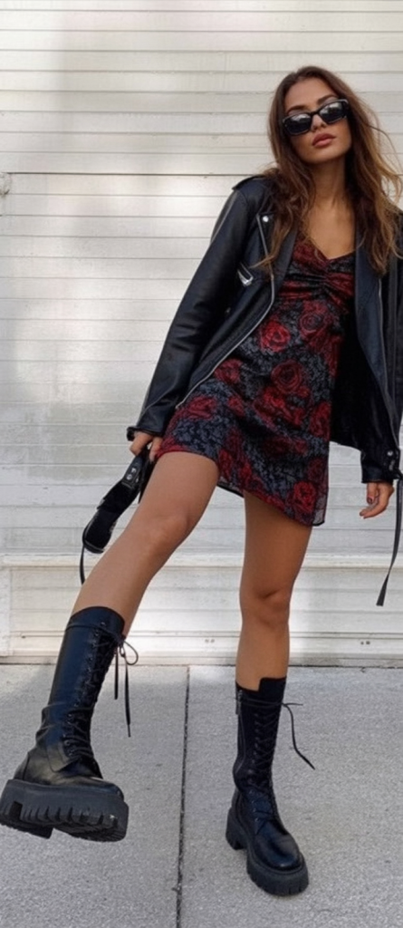 This outfit is pure attitude: a rose-print mini slip dress, a sharp leather jacket, and towering platform boots that mean you will be seen when you walk into the room. It’s romantic and tough in equal measure, perfect for concerts, bar hopping, or a date where you want to channel your inner rockstar. The sunglasses and minimal accessories keep the focus on the silhouette and those incredible boots.