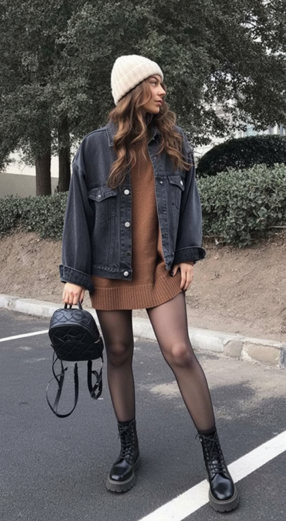 This outfit nails that off-duty model vibe: a warm brown sweater dress, sheer tights, hefty combat boots, and an oversized black denim jacket thrown on top. The beanie and little backpack keep it grounded, like you’re ready for a full day of walking, coffee, and people-watching. It’s tough and cozy all at once, ideal for 2026 winter days when you’re tired of bulky coats but still want to feel snug.