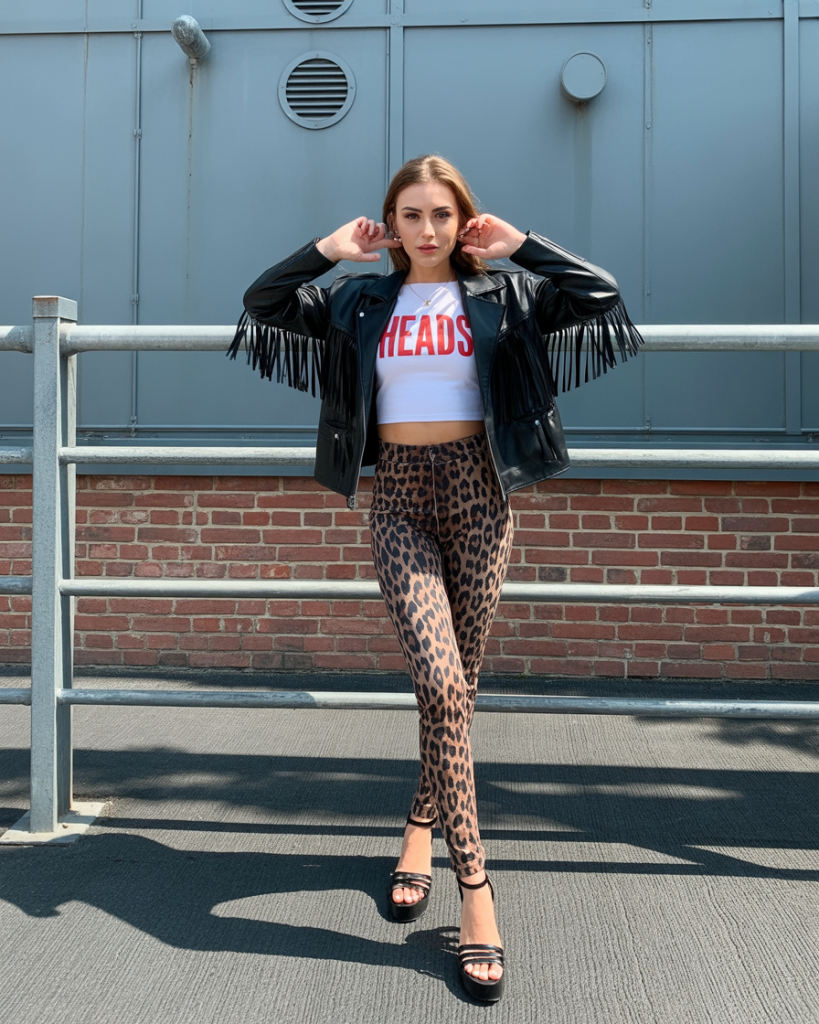 This is that “I woke up feeling fearless” outfit that makes you stand a little taller the second you zip up the jacket. The swishy fringe, the graphic crop top, and the sleek sandals give pure rock-chic energy, like you’re heading from a rooftop brunch straight to a concert. Leopard leggings add that playful wink that says you’re not afraid to dress to impress in 2026, even on a random Tuesday. It is bold, yes, but surprisingly wearable when you treat it as your superhero costume for city errands, date night, or girls’ night.