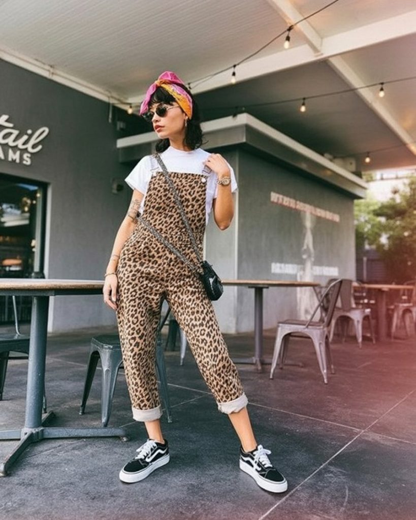 Leopard overalls might sound wild on paper, but here they feel unexpectedly approachable and fun. Layered over a crisp white tee with classic sneakers and a bright bandana, the whole outfit gives off creative, city-weekend energy. It is the kind of look that instantly sparks conversation at coffee shops and outdoor markets, like a walking Pinterest board of 2026 inspo. You look playful, not costume-y, and that’s the sweet spot.