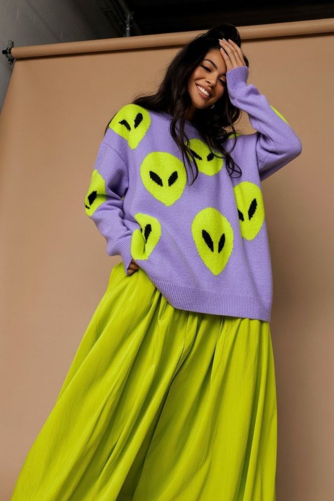This look is for the days you’re fully committed to being noticed. The lime skirt and lilac sweater with playful alien faces feel like street style straight from a fashion editor’s mood board. It’s whimsical, a bit cheeky, and completely unapologetic—exactly the kind of outfit that reminds you fashion is meant to be fun. You don’t blend into the crowd in this; you become the inspo other women save on their phones.