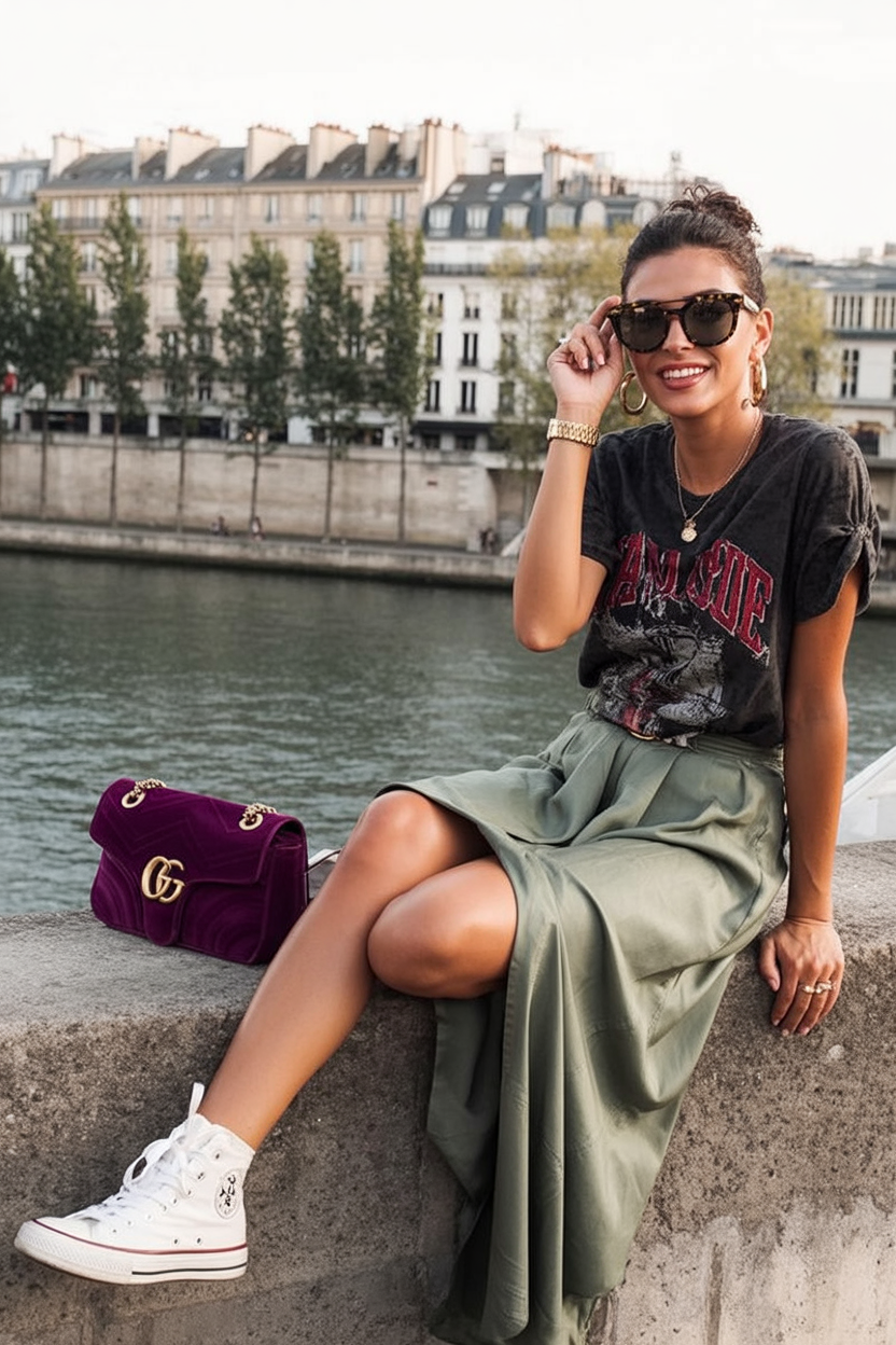 This outfit is proof that contrast is where the magic happens. A lived-in graphic tee with a silky skirt feels cool, effortless, and a little Parisian without trying to be. It has that “I just threw this on” energy that still looks intentional—perfect for spring days when you want comfort but crave style.