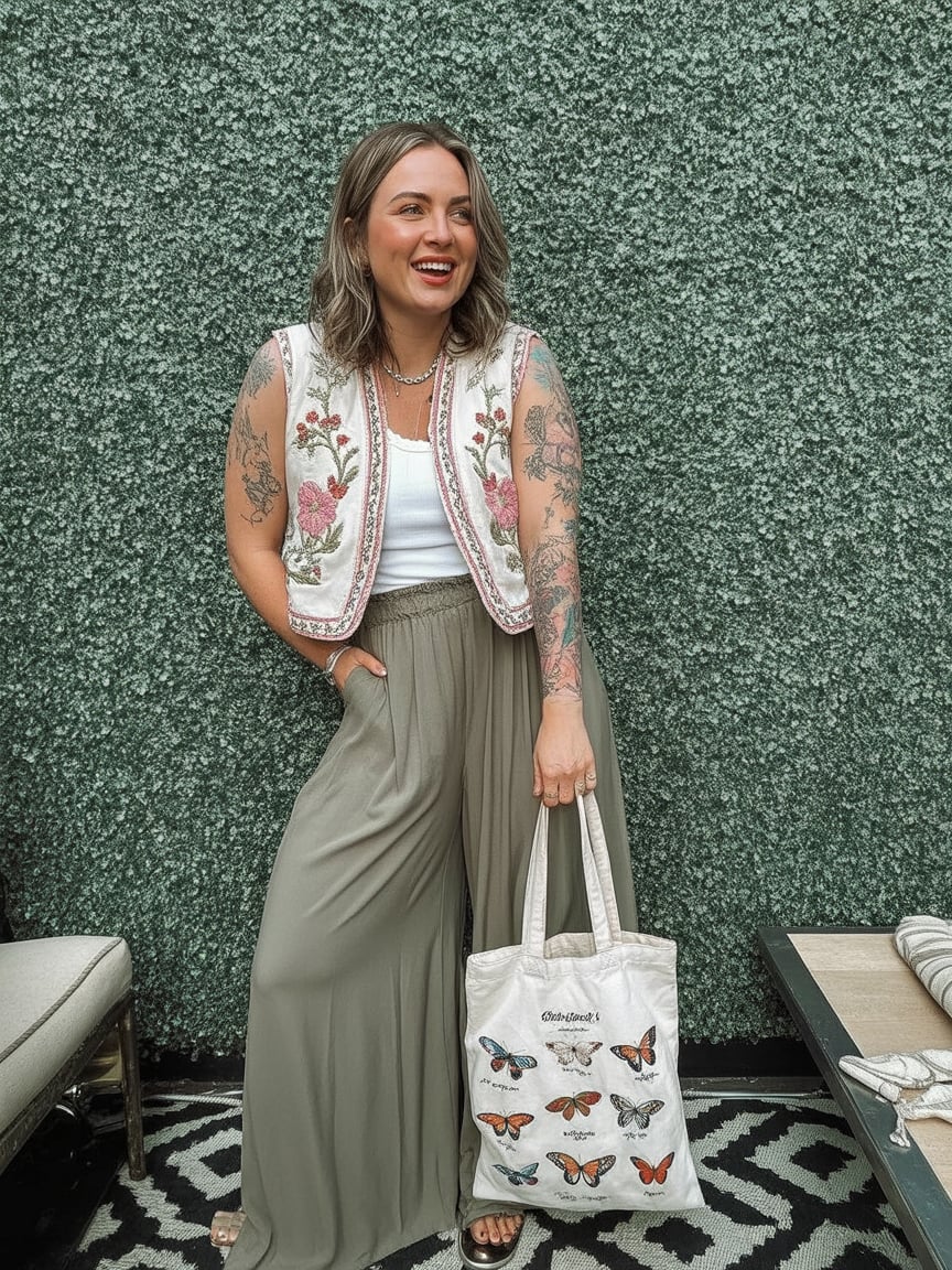 This look feels breezy, confident, and ready for sunshine. The cropped tank keeps things light, while the flowing printed pants add movement and personality. It’s relaxed but intentional—perfect for warm spring afternoons.