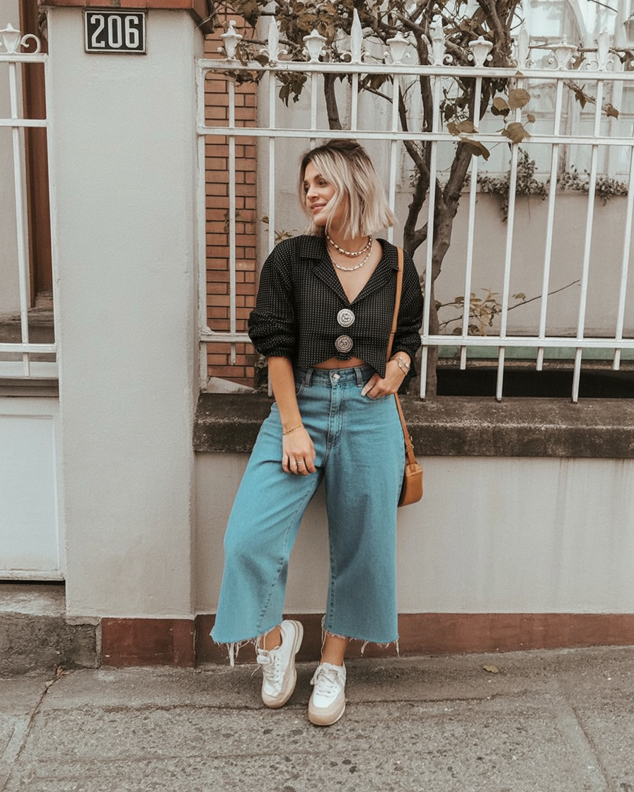 This outfit has a soft retro feel that’s incredibly flattering and modern at the same time. The cropped cardigan balances beautifully with relaxed wide-leg jeans, creating a silhouette that feels both playful and polished. It’s the kind of look that makes you stand a little taller.